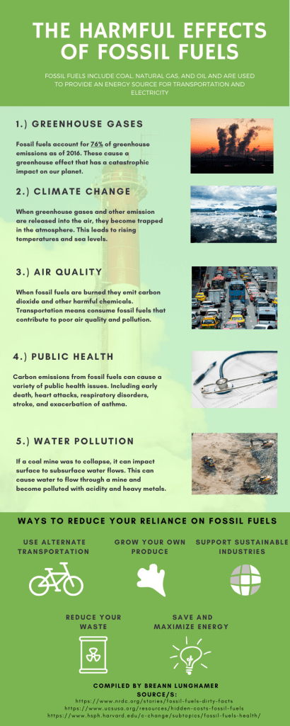 The purpose of this infographic is to display the harmful effects of fossil fuels and ways that people can reduce their reliance on fossil fuels.